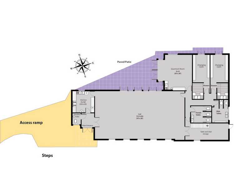 Main Hall: 15.9 x 8.6 (50’ x 28’)